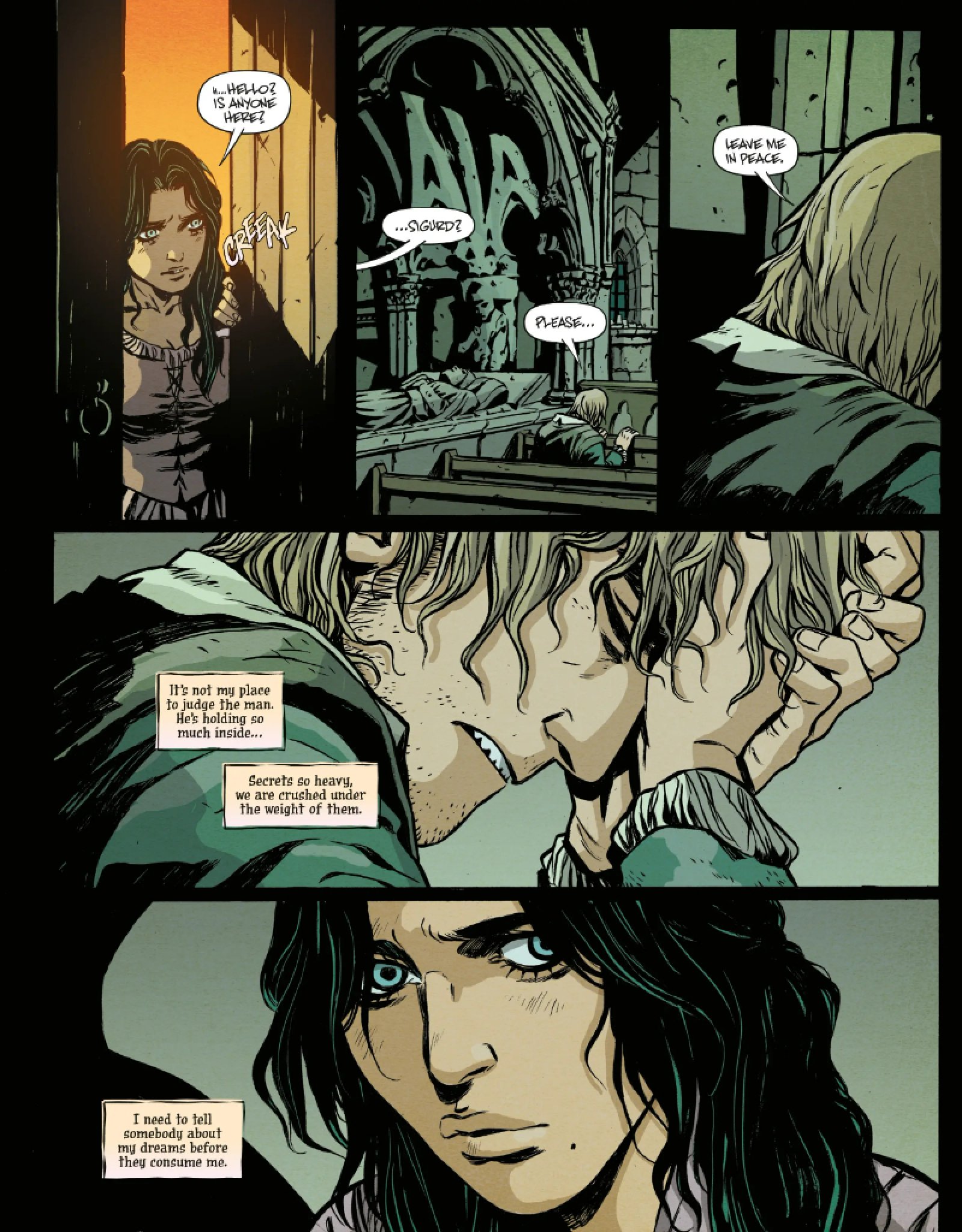 Avec Somna, le duo d'autrice formée par Becky Cloonan et Tula Lotay nous propose un conte situé dans un pan des plus sombres du moyen age et de l'histoire du christianisme. À une époque où la femme est soumise, réprimée, reléguée au second plan. Où tout écart de comportement peut la conduire au bûcher. À une époque où l'inquisition et le patriarcat régnaient en maître, les femmes se voyaient obligées de réprimer leur pulsion sous peine d'être accusées de sorcellerie et de finir au bûcher. Le récit sur fond de fantastique traite des désirs refoulés et réprimés, leur donnant corps par des projections démoniaques. Nous faisant osciller constamment entre rêve et réalité jusqu'à ne plus bien savoir où est la frontière entre les deux. Le traitement graphique colle parfaitement au récit et vient sublimer cet aspect.