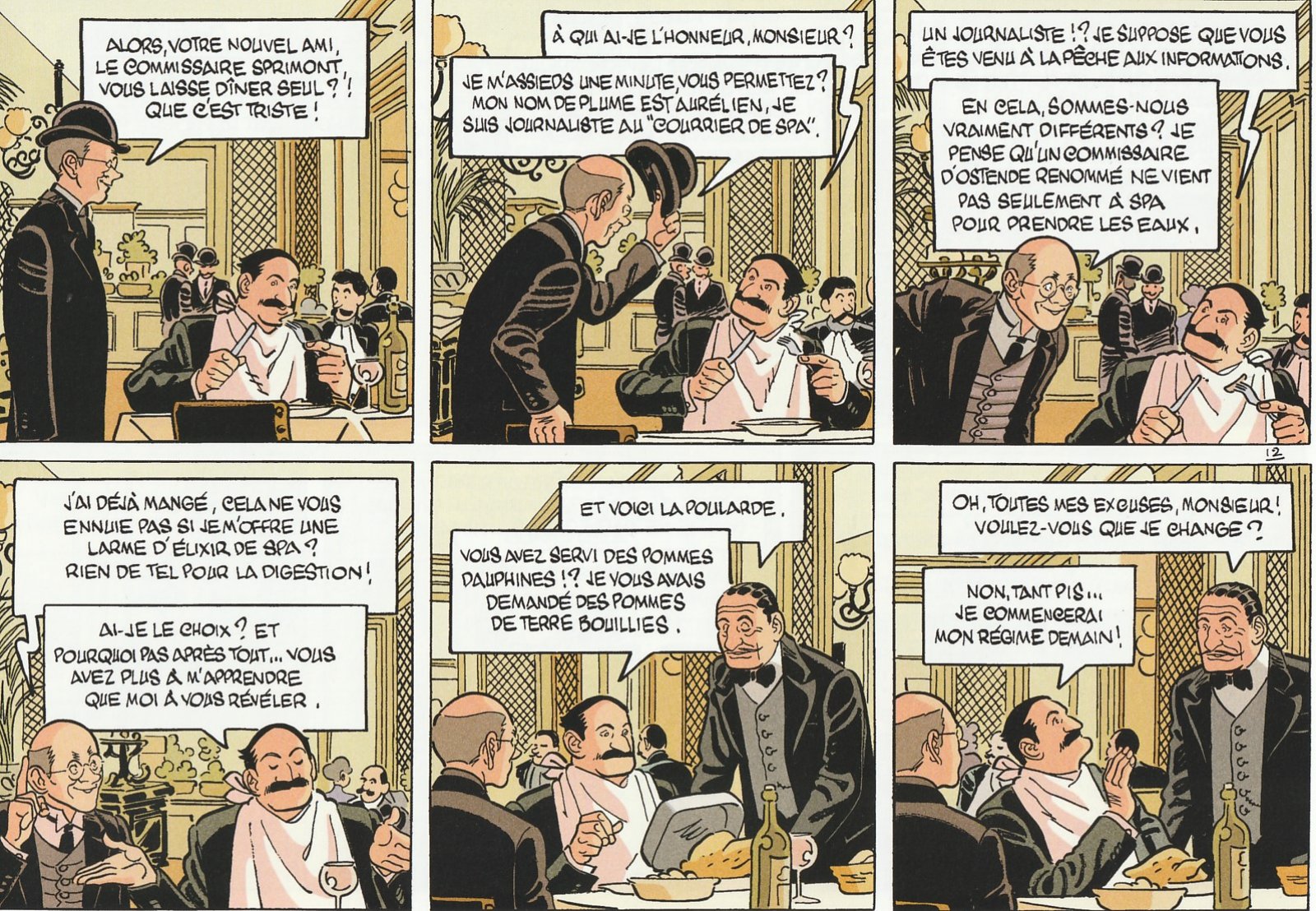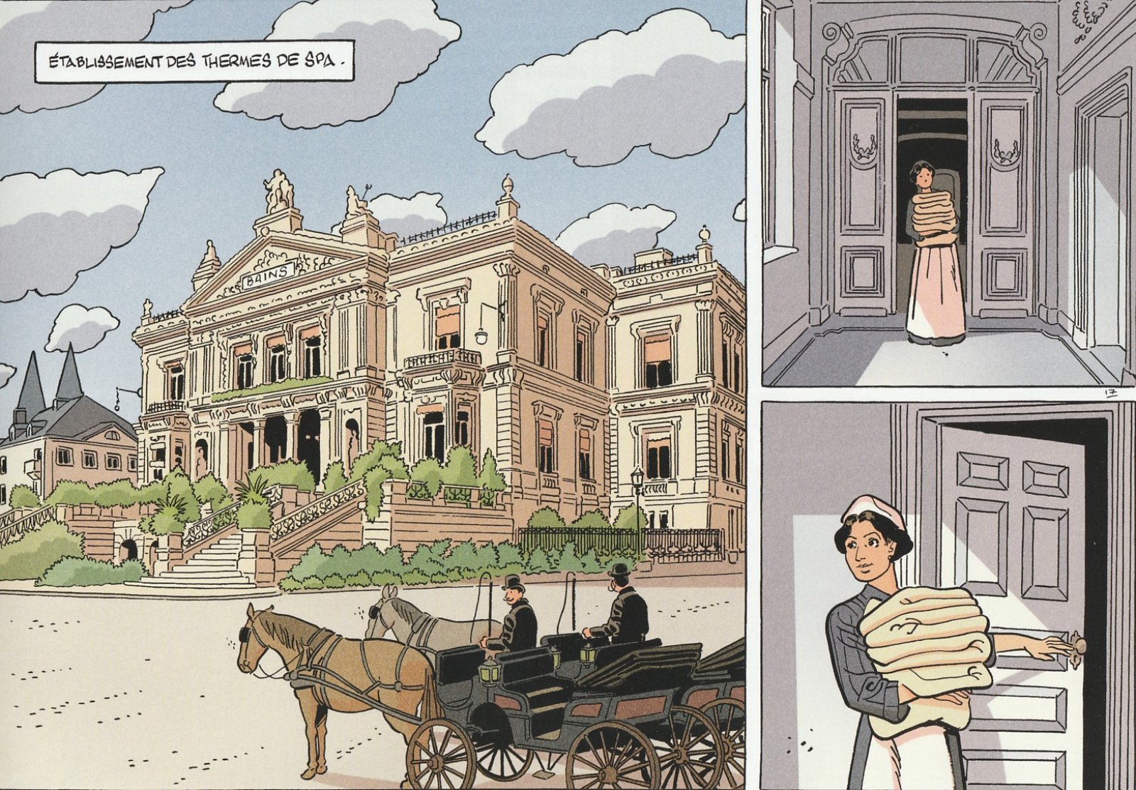 Voilà donc le 2e opus des aventures d’Hendrikus Ansor. Vu d’outre-Quiévrain, il n’y a pas de doute, on va assister à une histoire belge ! Et c’est tout à fait cela ! Oubliez cependant les blagues de Coluche et regardez plutôt du côté du plus célèbre détective à la moustache, Hercule Poirot. L’affable et épicurien Hendrikus Ansor, commissaire émérite d’Ostende est convoqué de toute urgence par le palais. La fille du roi, la princesse Clémentine, est victime d’un odieux chantage. S’ensuit alors une enquête policière à l’ancienne, faite de rencontres et d’interrogatoires plus ou moins formels, d’intuitions et de déductions. Si les plus jeunes trouveront qu’il s’agit d’un train de sénateurs, les autres retrouveront les charmes de Mary Higgins Clark ou de Georges Simenon. Point de bagarre, peu de cadavres et très peu de police scientifique (seul un médecin légiste à l’humour corrosif !), Patrick Weber privilégie l’humain, la sociologie et la réflexion. Le scénariste prend un malin plaisir à perdre son lecteur en conjecture et fausses pistes. Il s'amuse à décaler les révélations et à innocenter à contretemps les coupables idéaux. Il faut dire que sa gestion des personnages est irréprochable. Et bien malin celui qui aura plus de cellules grises que le commissaire Ansor. Une intrigue à l’ancienne portée par un traitement graphique très classique, Olivier Wozniak rend une copie en tout point irréprochable. Et puisque le cadre sert de titre, difficile de ne pas débuter par les décors spadois du début du XXe siècle absolument magnifiques. Si on sent l’intense travail de préparation, c’est pour montrer toute la démesure des stations thermales de cette époque ! C’est luxueux ! c’est clinquant ! et c’est magistralement représenté ! Les personnages ne sont pas en reste avec un traitement proche de la ligne claire. Moustachu ou chauve, en uniforme ou en tenue de soirée, il se dégage de chacun d’eux une belle énergie et beaucoup de charme. La colorisation, dans des teintes sobres, renforce l’impression d’élégance et de distinction propre à la Belle Epoque.
