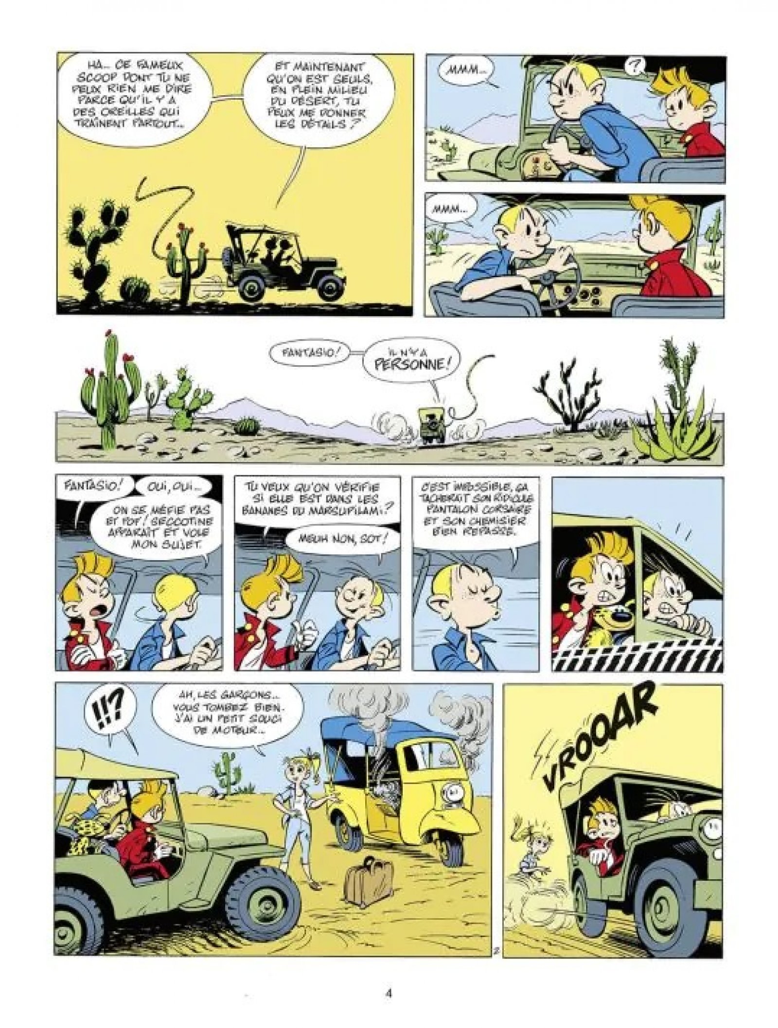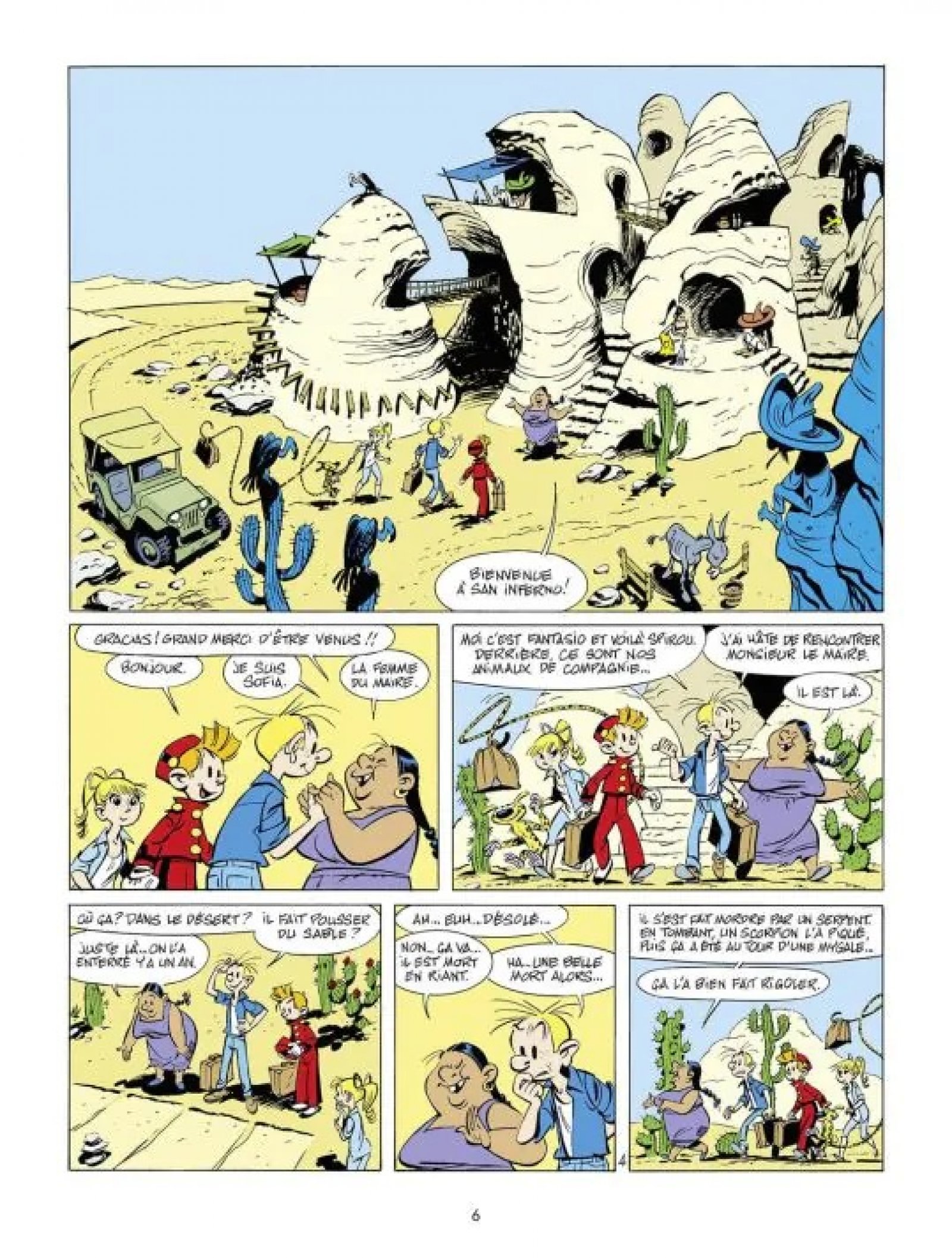 Tarrin est ici associé à Lewis Trondheim pour une aventure désertique dont la première originalité réside dans le casting : Spirou, Fantasio, Seccotine et le Marsupilami (mais pas… Spip !). La répartition des rôles est parfaitement dosée : un Spirou aventurier et réfléchi, un Fantasio survolté et drôle, une Seccotine fouineuse mais courageuse, et un Marsupilami qui pourrait bien susciter quelques inquiétudes chez les fans. À ce quatuor s’ajoutent des personnages secondaires savoureux, notamment les petits oiseaux volubilos, une trouvaille à la fois discrète et maligne. « Ah oui, maintenant que vous le dites… » (clin d’œil à découvrir dans l’album !)