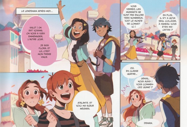 ce sont surtout leurs filles qui vont nous intéresser. Dès leur arrivée, on comprend qu'elles sont totalement différentes. Physiquement bien sûr mais aussi psychologiquement. Là où Atalante est enthousiaste, Mégara reste sur la réserve. Ensemble, pourtant, elles vont se lier d'amitié avec d'autres élèves de leur école. Séparément, elles vont connaître leurs premiers émois et se fixer un cap pour l'avenir. C'est donc à une double quête de construction, un double récit initiatique que nous invite Natacha Godeau. Et puisque le temps n'a pas la même importance sur Stellaria que sur Terre, la scénariste multiplie les ellipses plus ou moins longues, plus ou moins bien intégrées, cela donne un récit un peu saccadé, pour ne pas dire chaotique mais qui ravira les jeunes lecteurs et lectrices. Un récit où l'amitié et l'amour sont l'alpha et l’oméga de la vie des lycéens, comme sur Terre en fait ! Afin d'accrocher encore un peu plus ce lectorat exigeant, Sarah Lozoya opte pour un trait d'inspiration manga. Les gros yeux ronds des personnages, leurs émotions exagérées, leurs différences et les couleurs flashy sont autant d'éléments de séduction massive. Le quartier résidentiel où vivent les Kent est suffisamment humain pour faciliter l'identification aux personnages. Pourtant, les décors ne sont pas forcément très nombreux. Et les trop rares (à mon avis)