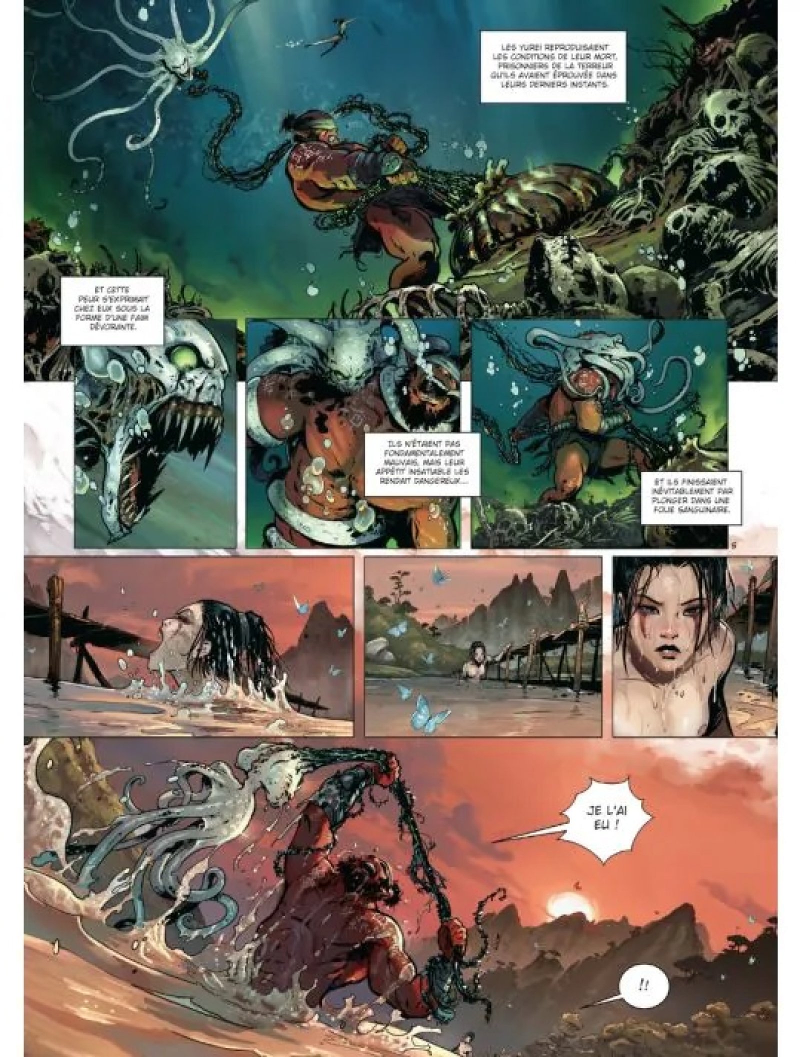 Leur première confrontation les oppose à un Yurei des étangs, le fantôme d’une noyée devenue prédatrice. En quelques planches, Jarry installe une ambiance mystique et tragique, portée par un duo complémentaire : Mei-Jen, empreinte de compassion et de sagesse, face à Zhao, guerrier taciturne et redoutable, dont la nature même demeure mystérieuse.