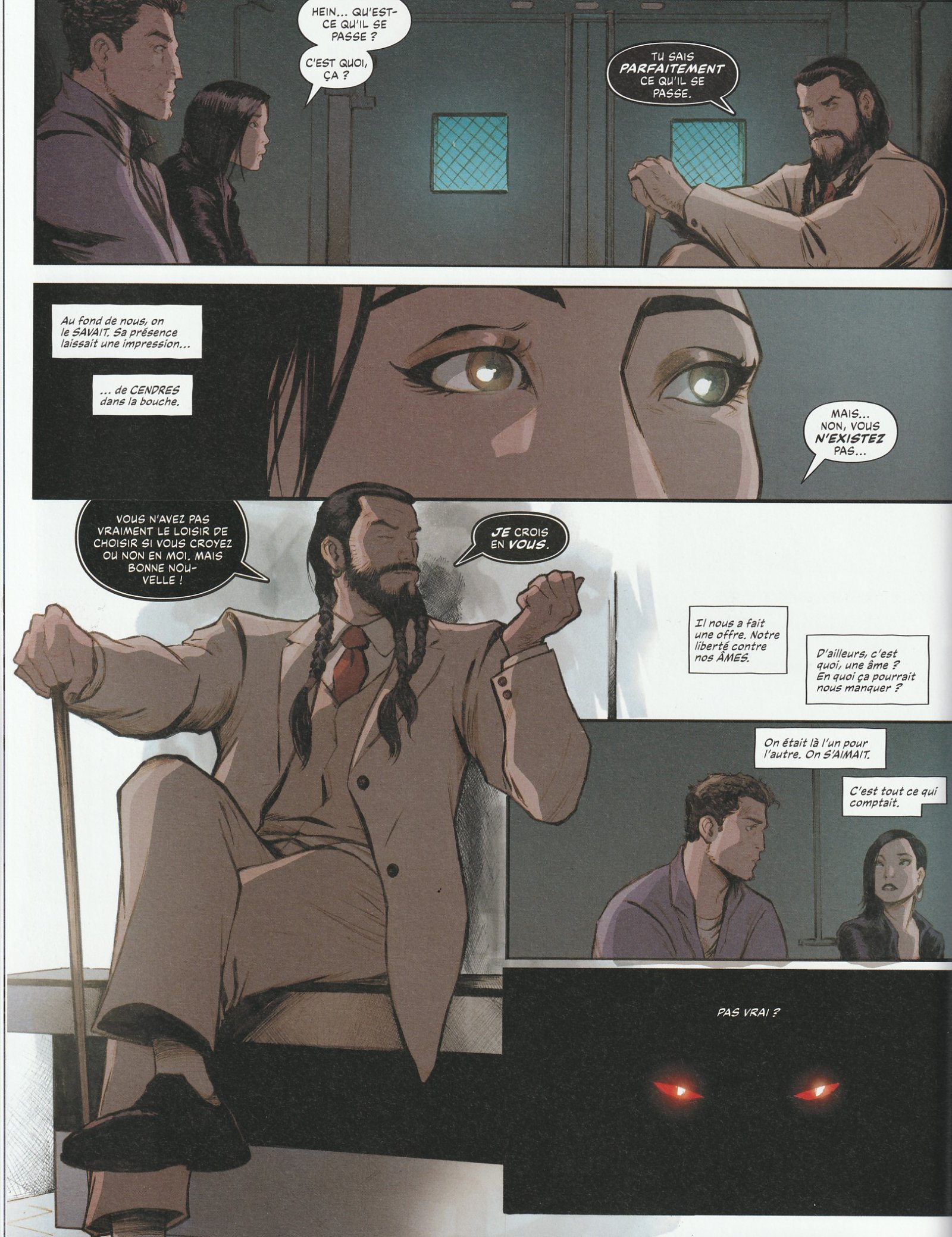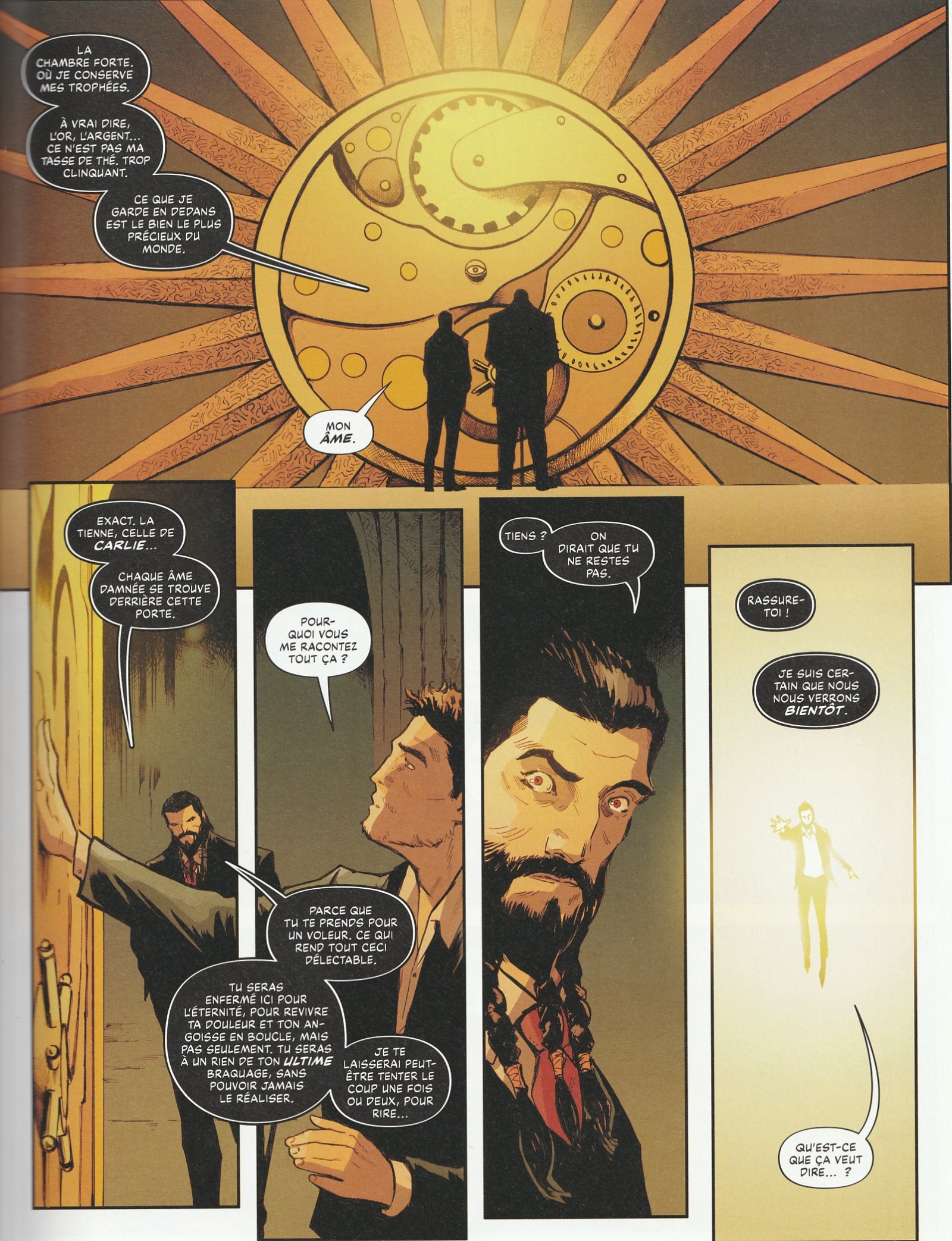 Mais quel kiff !! Comme beaucoup, j’avais vu passer cet album sur le site Delcourt. On peut se l’avouer, ce n’est pas parce que l’éditeur clame haut et fort la sortie d’un album qu’il est bon. C’est même parfois tout le contraire. Et puis ici, je dois avouer avoir été fort intrigué par cette couverture sombre, aussi élégante qu’énigmatique. J’admets pourtant une petite lenteur à l’allumage. Il m’a fallu relire la première double page. Il faut dire que la présentation des personnages est pour le moins originale et explosive. Joe Henderson ne s’encombre pas de choses superflues. De toute façon, ce qui manque sera présenté au fur et à mesure. Surtout, cela se fait grâce à une voix-off qu’on identifie vite comme étant celle d’Owen. Rien de très excitant même si le rythme est déjà très élevé. Et puis arrive l’inévitable arrestation et l’apparition d’un nouveau personnage, le diable ! Toute ressemblance avec l’acteur Jason Momoa étant totalement fortuite. Si le rythme ralentit alors, ce n’est que pour mieux laisser le temps au lecteur de comprendre les conséquences de ce pacte faustien. Après, cela repart de plus belle, avec la visite privée de l’enfer et la préparation du braquage. Chose assez inimaginable, on a l’impression que cela n’en finit pas. D’une manière très linéaire, tout s’enchaîne à un rythme tel qu’on en oublie tout ce qui nous entoure : seul compte le résultat ! Ce rythme diabolique n’est pas sans faire penser à celui d’une autre équipe de braqueurs, Ocean’s Eleven de Steven Soderbergh. Il existe pourtant une sacrée différence. Certes, le casino appartient au diable mais, surtout, tous les voleurs lui ont vendu leur âme et ce n’est certainement pas pour de nobles raisons…. Comme au cinéma et au casino, tout le talent du scénariste consiste alors à cacher son jeu, jusqu’à la révélation. Attendez-vous à des coups tordus et à de sacrés retournements de situation ! Pour faire d’un bon scénario, il faut un excellent album ; il faut le confier à un bon dessinateur et Lee Garbett est un très bon dessinateur. Les personnages sont charmants et attachants. Les décors sont très réalistes. Comme quoi, l’enfer ressemble bien à la réalité. Mais c’est surtout la construction qui marque. Le style comics avec ses grandes cases de tailles et de formes différentes et les inserts disséminés un peu partout sont un pur régal pour les yeux. Cela a également un rôle important dans la fluidité de la lecture et dans le rythme qui va crescendo. Cerise sur le gâteau, le coffre-fort révèle un petit côté fantastique totalement irrésistible.