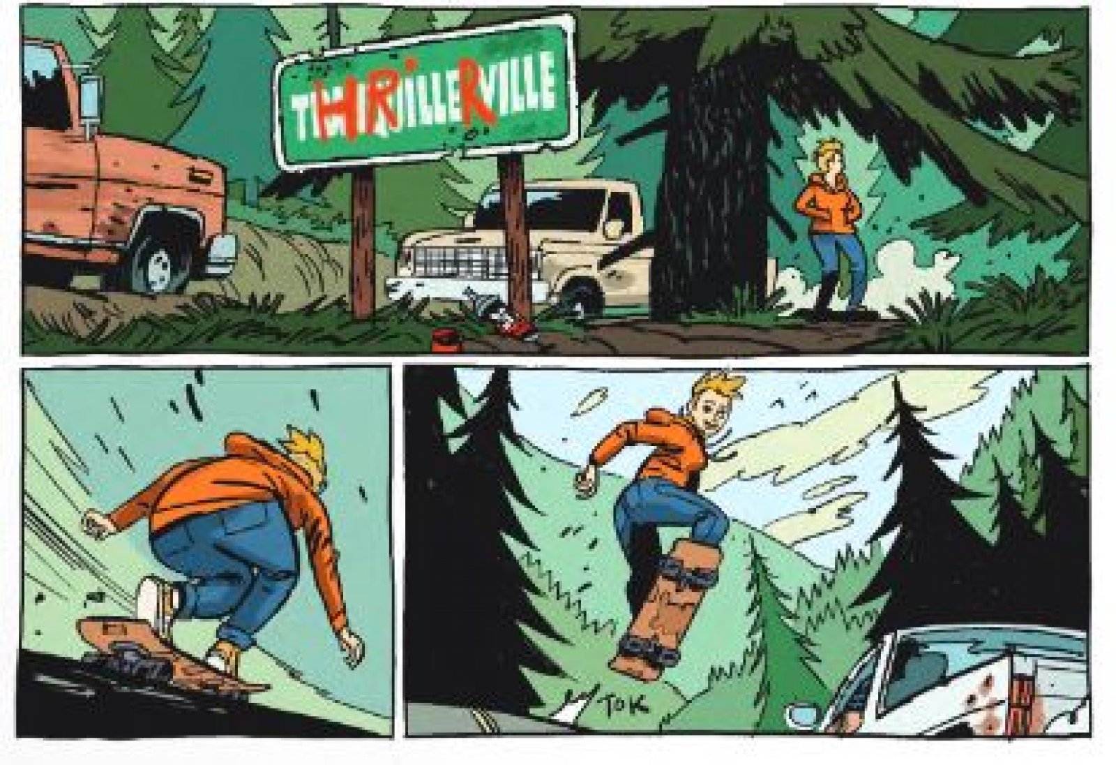 Thrillerville, c’est d’abord un cri d’amour au cinéma d’horreur des années 1980. Lerenard, scénariste et ancien story-boarder, y convoque tout un pan de la culture populaire — du monstre du lac à la Frankenstein, du tueur masqué à la Tarantino — pour les revisiter à sa manière : avec humour, tendresse et un sens aigu du rythme.