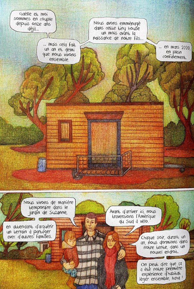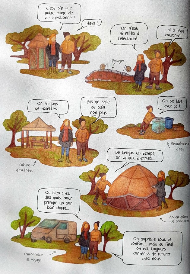 Emilie SAITIS, colocataire d’une villa en région parisienne, souhaite envisager sa vie autrement pour limiter son impact sur l’environnement, et changer ses rapports avec la nature. Cette volonté l’amène ainsi à rencontrer par exemple Manon et Sébastien qui vivent dans un dôme, un habitat léger sans impact sur le milieu, dans une forêt de chênes dans le Grand-Est. L’ouvrage nous livre un compte-rendu de ses diverses visites et rencontres. Le lecteur en apprend alors davantage sur des modes de vie en marge de la société en même temps qu’ Emilie SAITAS.