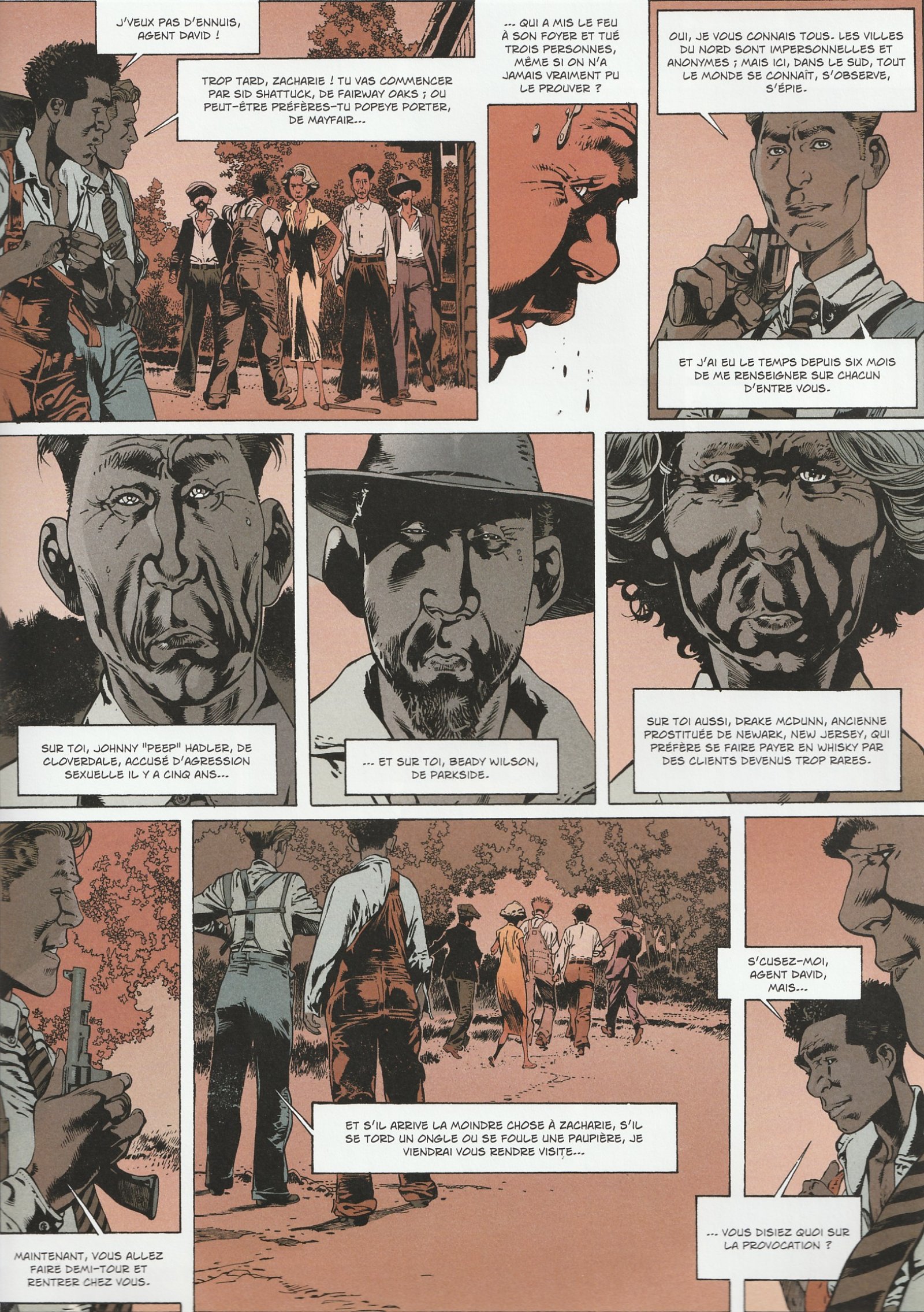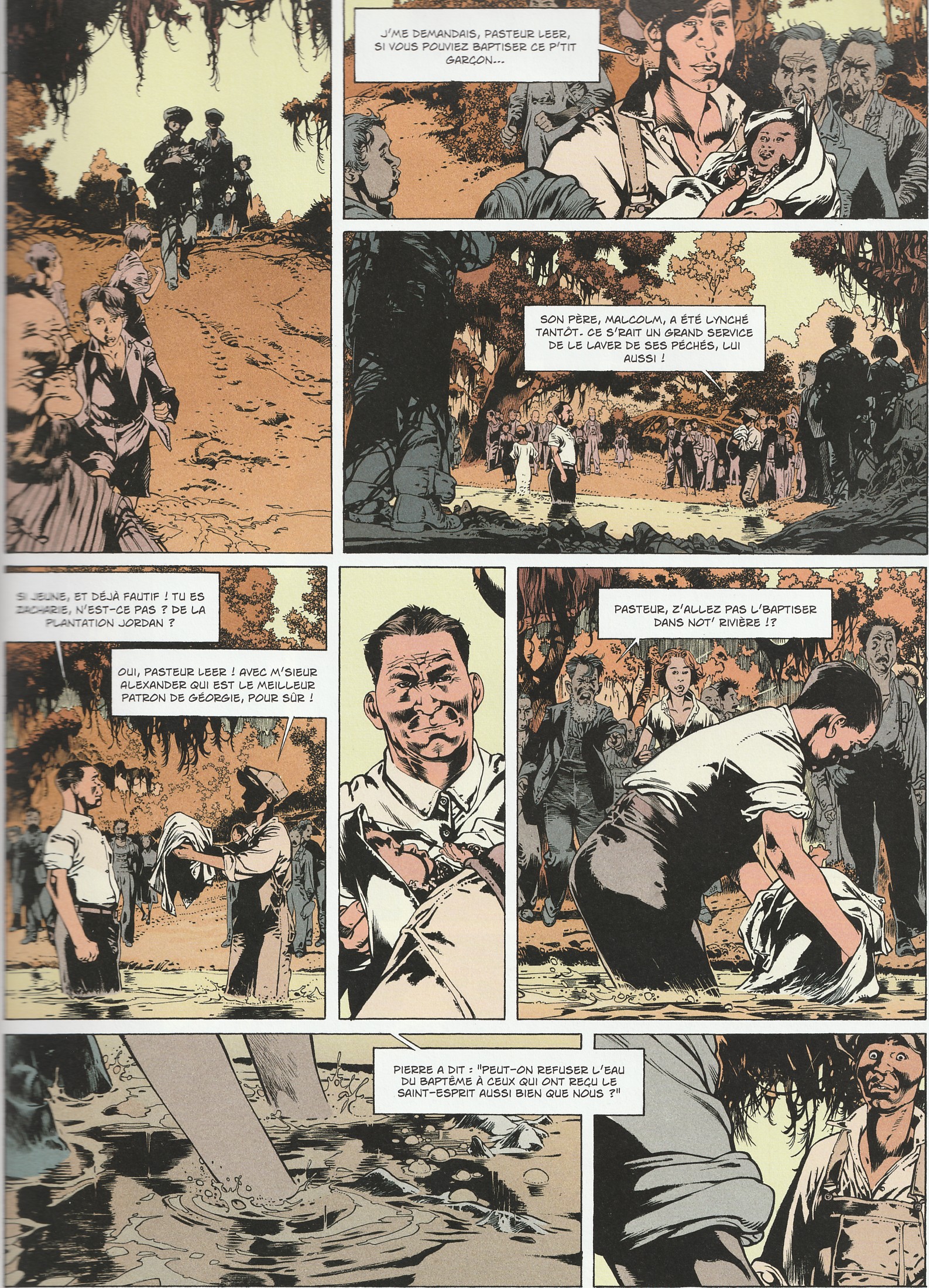 Après l’ouverture de leur trilogie Trois touches de noir avec l’excellent Quelque chose de froid, Philippe Pelaez et Hugues Labiano poursuivent l’aventure en changeant de décor. Au Sud, l’agonie nous plonge dans une Géorgie de 1926 accablée par la chaleur, la ségrégation et les rancœurs. À Savannah, la Bible justifie tout, y compris les pires lynchages du Ku Klux Klan. Pourtant, un jeune agent du FBI mène son enquête sur ce qui ressemble fort à un meurtre maquillé en lynchage. Cette investigation sert de fil conducteur à l’album. Néanmoins, plutôt que de multiplier les rebondissements, Philippe Pelaez privilégie une atmosphère sombre où les non-dits et la peur règnent en maîtres. Une véritable fresque sociale prend ainsi vie sous nos yeux. Difficile de désigner un personnage central. Il y a bien sûr le détective Jonathan David, qui débarque dans cet univers avec son esprit rationnel et démocratique venu du Nord, mais aussi ses propres zones d’ombre. Il peut compter sur le soutien de Zacharie Daniel, jeune métis et figure d’une résistance teintée d’interdits. Face à eux se dresse une communauté marquée par la guerre de Sécession, l’abolition de l’esclavage et les prémices du communisme, menée d’une main de fer par le pasteur Leer. Autour de ce trio gravite une galerie de personnages secondaires aux convictions bien ancrées, mises à mal par les événements. L’album offre ainsi une clé de lecture pour comprendre ce Sud des États-Unis, encore aujourd’hui réceptif à certains discours politiques contemporains. Cette tension omniprésente est rendue palpable par les traits rugueux d’Hugues Labiano. Le dessinateur de Black OP et Dixie Road connaît bien les États-Unis. Grâce aux regards fuyants et aux silences pesants, il insuffle une âme , fût-elle maudite — à ses personnages et, par ricochet, à cette histoire. La moiteur devient presque tangible, les ombres semblent se coller aux corps, formant une véritable chape de plomb que le lecteur ressent pleinement.