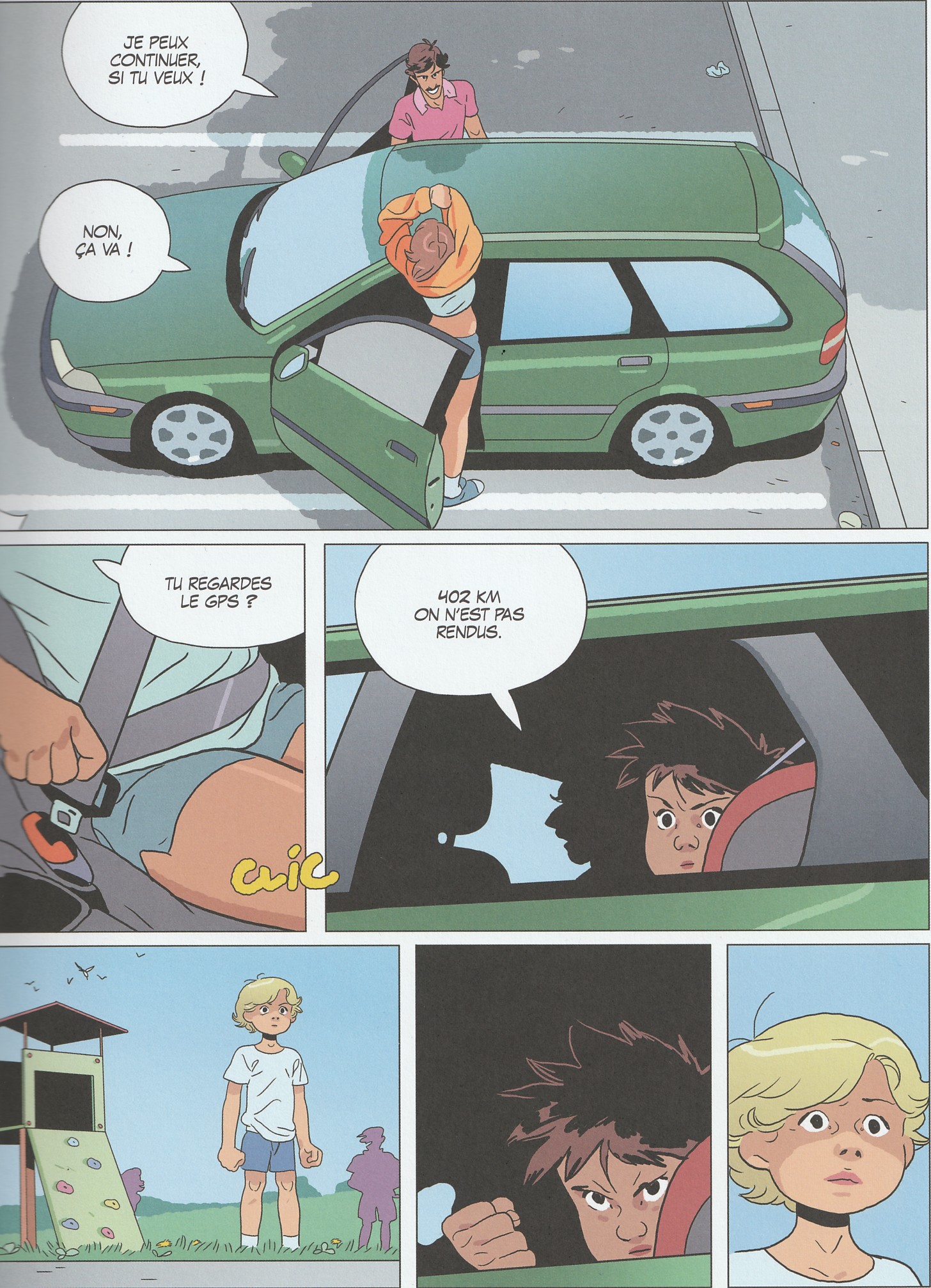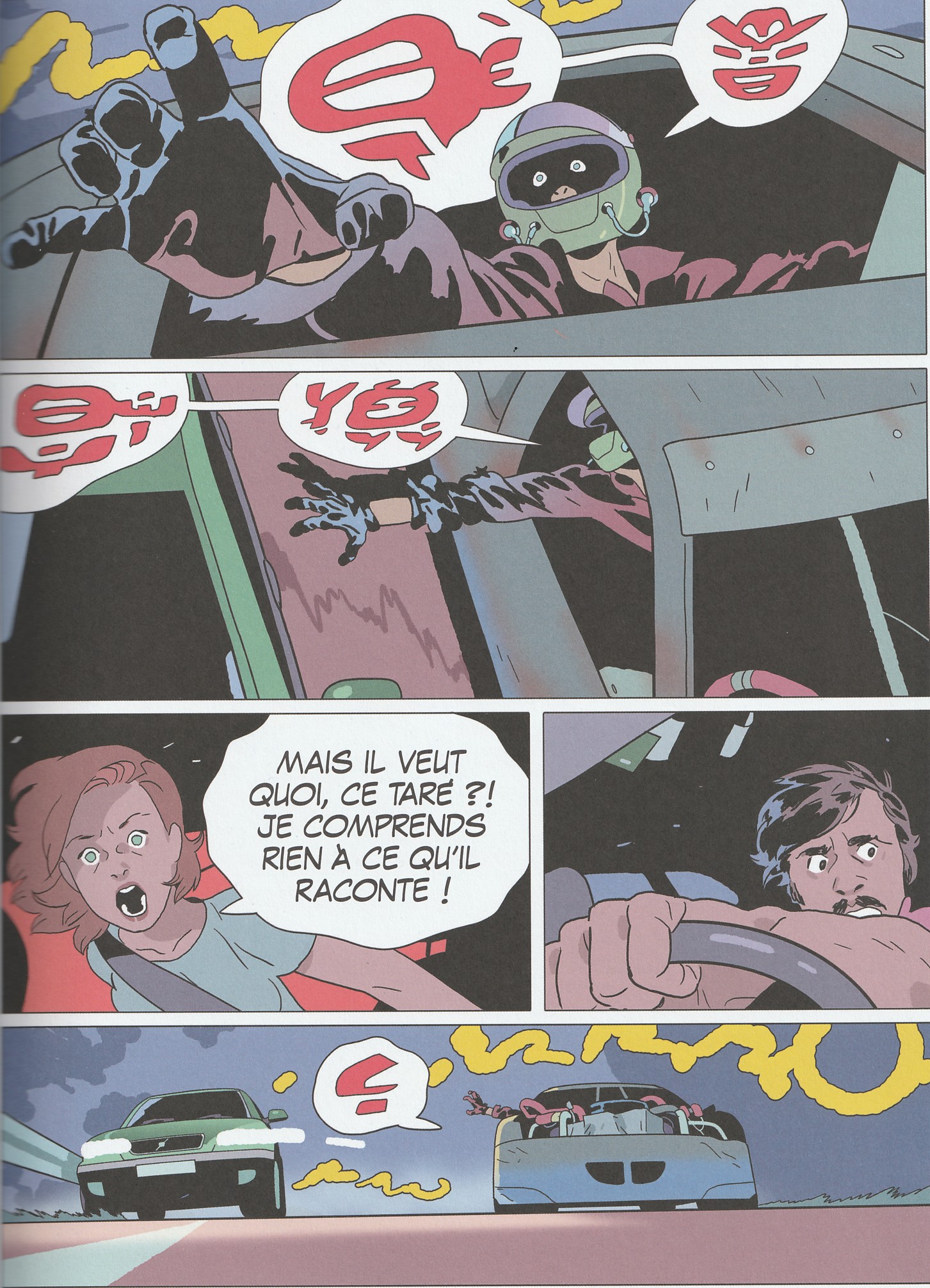 Bien que j’aie déjà aperçu les ouvrages de Mickaël Sanlaville dans les rayonnages de ma librairie préférée, je n’avais encore jamais lu aucun de ses albums. Tunnels est donc pour moi une première; et même une première à double titre. En effet, ce roman graphique ne ressemble à rien de ce que j’ai pu lire auparavant. Bien sûr, on identifie certaines références de la pop culture, notamment les premiers épisodes de la saga Mad Max. Les bolides arborent d’ailleurs bien plus que la simple couleur de l’Interceptor du policier maudit. Mais n’allons pas trop vite, si j’ose dire. L’album débute par une scène ordinaire pour quiconque a déjà fréquenté les aires autoroutières lors des grands départs en vacances : un pique-nique familial, des querelles entre enfants et une aire de jeux. Pour Mickaël Sanlaville, il n’en faut pas plus pour nous présenter ses personnages. Là encore, rien d’exceptionnel : un couple et ses trois enfants âgés de 2 à 15 ans. Seule particularité, le père tient énormément à son break Volvo. Puis, sans que la famille, ni le lecteur, ne s’en aperçoive, la voilà projetée dans un univers parallèle où GPS et téléphones sont inopérants, et où toutes les voitures participent à une course où tous les coups sont permis. Enfermée dans l’automobile, la famille ne comprend pas ce qui lui arrive. Dans ce huis clos fantastico-routier, le scénariste fait monter la pression aussi sûrement que celle des turbos des bolides. On suit ainsi les interrogations des personnages, tout comme leurs traumatismes à chaque accrochage ou carambolage. On se situe davantage dans La Course à la mort que dans Les Fous du volant. Toutefois, Sanlaville nuance la tonalité en concluant son récit sur une note plus sombre, avec l’évocation de la perte d’un être cher. Côté dessin, l’auteur reste fidèle au style qui a fait sa réputation. Bien qu’enfermés dans les voitures, les personnages évoluent dans un univers où l’impression de mouvement est omniprésente. Mieux encore, le sentiment de vitesse est saisissant, presque envoûtant. Inconsciemment, le lecteur se surprend à vouloir participer à cette course — tout en restant confortablement installé dans son canapé. Le lien avec les jeux vidéo est indéniable. La colorisation, à la fois pastel et vive, vient dynamiter cette atmosphère glauque et violente. Enfin, précisons que l’épilogue est totalement inattendu et résolument ouvert. Ne vous attendez donc pas à des révélations fracassantes, mais plutôt à un malaise persistant, susceptible de vous prendre aux tripes à chaque passage de tunnel ou à chaque panne de GPS…