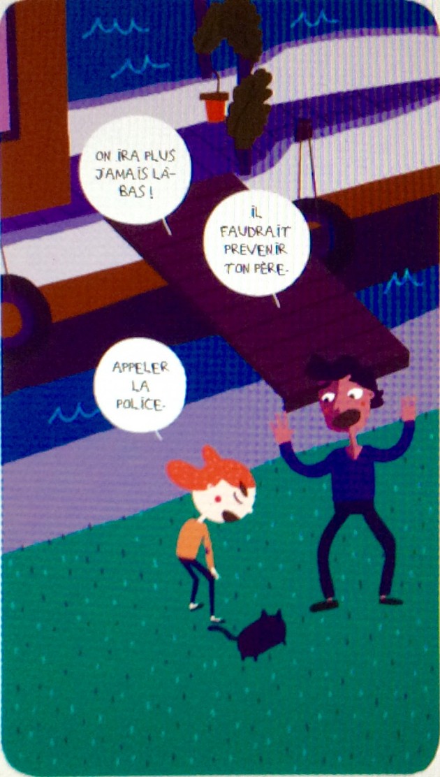 Ultra-violette, Bitume (son chat) et Galette (son meilleur ami) vont s’introduire dans la baraque du bout du canal, car ils soupçonnent la nouvelle voisine d’être un serial killer. Ils vont trébucher sur des jambes et se sauver en courant, terrorisés. L’intuition d’Ultra-violette s’avère-t-elle véridique ? Mais le pire est à venir. Le lendemain, la nouvelle voisine rend visite au père d’Ultra-violette et l’invite dans sa demeure : « Avant que je ne dise quoi que ce soit, la voilà qui grimpe à bord ! Et mon nigaud de père qui arrive ventre à terre !». Ultra-violette n’arrive pas à dissuader son père d’accepter l’invitation. Qu’est-ce que ce serial killer va faire du père d’Ultra-violette ? Elle décide de l’accompagner chez la nouvelle voisine...
