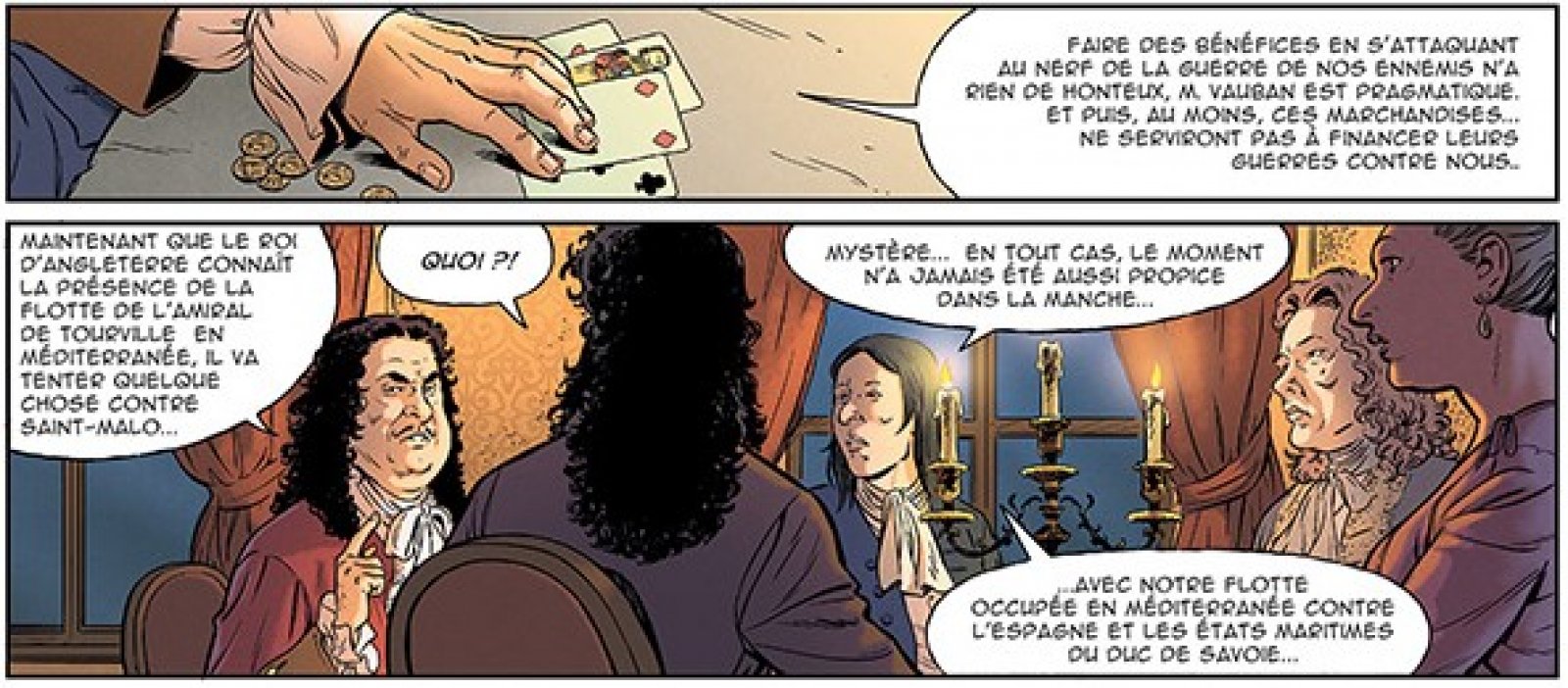 Jean-François Miniac signe un scénario dense (parfois presque trop à mon gout) et documenté. En s’appuyant sur un épisode réel (le raid anglais contre Saint-Malo en 1693), il tente de restituer l’atmosphère tendue de la fin du XVII? siècle, où la France, assiégée par la coalition de Guillaume d’Orange, doit défendre ses côtes et ses ports corsaires. L’auteur ne se contente pas d’un simple récit de guerre : il tisse une intrigue où espionnage, politique et religion s’entrecroisent.