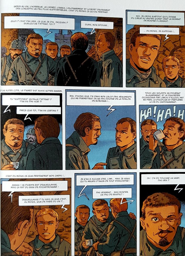 Alors que des Poilus de toutes origines géographiques et viticoles s’apprêtent à combattre, le « pinard » occupe une place importante pour ces hommes. En effet, outre le fait de leur rappeler leur terroir comme le Languedoc pour Gaston ou la Bourgogne pour Polo, le vin leur permet de s’oublier dans cette boucherie qui n’a rien d’héroïque. D’ailleurs, Polo ira combattre après avoir bu toute une bouteille d’absinthe que le mercanti lui avait obtenue. Se déroulant en Champagne, on suit également le vigneron Jacques dont le fils Grégoire se morfond dans une cave transformée en salle de classe attendant avec impatience d’être ouvrier viticole tandis qu’une grande famille de viticulteurs vit dans son sang les hostilités franco-allemandes.