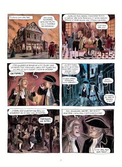L'album nous emmène dans sa jeunesse et sa vie parisienne, des salons aux théâtres et aux cafés comme le célèbre Procope. D'abord embastillé, puis libéré par lettre du Régent du Roi de France, Voltaire tâchera dans tout l'album de diffuser son œuvre théâtrale et à chercher la protection de riches femmes nobles.