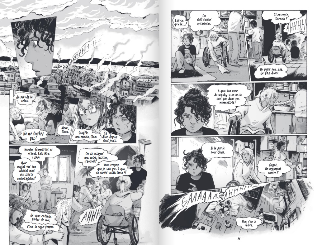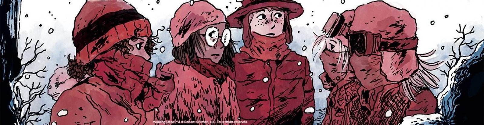 Troisième et dernier volet pour ce spin off de la série Walking Dead issu du jeu vidéo Clementine. Clementine, Olivia, Ricca, Fen, Derrick et Saa sont maintenant en « sécurité » même si on ne l’est jamais vraiment dans Walking Dead, dans un camp situé au Groenland. Ce côté sécuritaire permet à Tillie Walden, l’auteure, de pouvoir travailler sur des thématiques différentes comme la perte d’un être cher, l’accouchement, la naissance d’un enfant (évènement important qu’elle a connu durant l’écriture de ce tome), les relations humaines, les divergences d’opinion. Autant de sujets qui mettent les zombies, la survie, le monde apocalyptique au second plan au grand dam de toutes les personnes qui tiennent entre les mains un album de Walking Dead. Cependant l’auteure réussit à placer quelques scènes de suspense au moment où l’on pense que tout est calme, la marque de fabrique de la série.