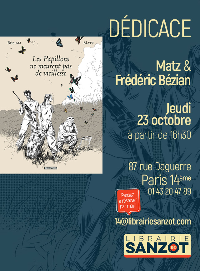Nous sommes très heureux d’accueillir Matz et Frédéric Bézian chez Sanzot 14 le jeudi 23 octobre à partir de 16h30 pour leur album Les Papillons ne meurent pas de vieillesse.